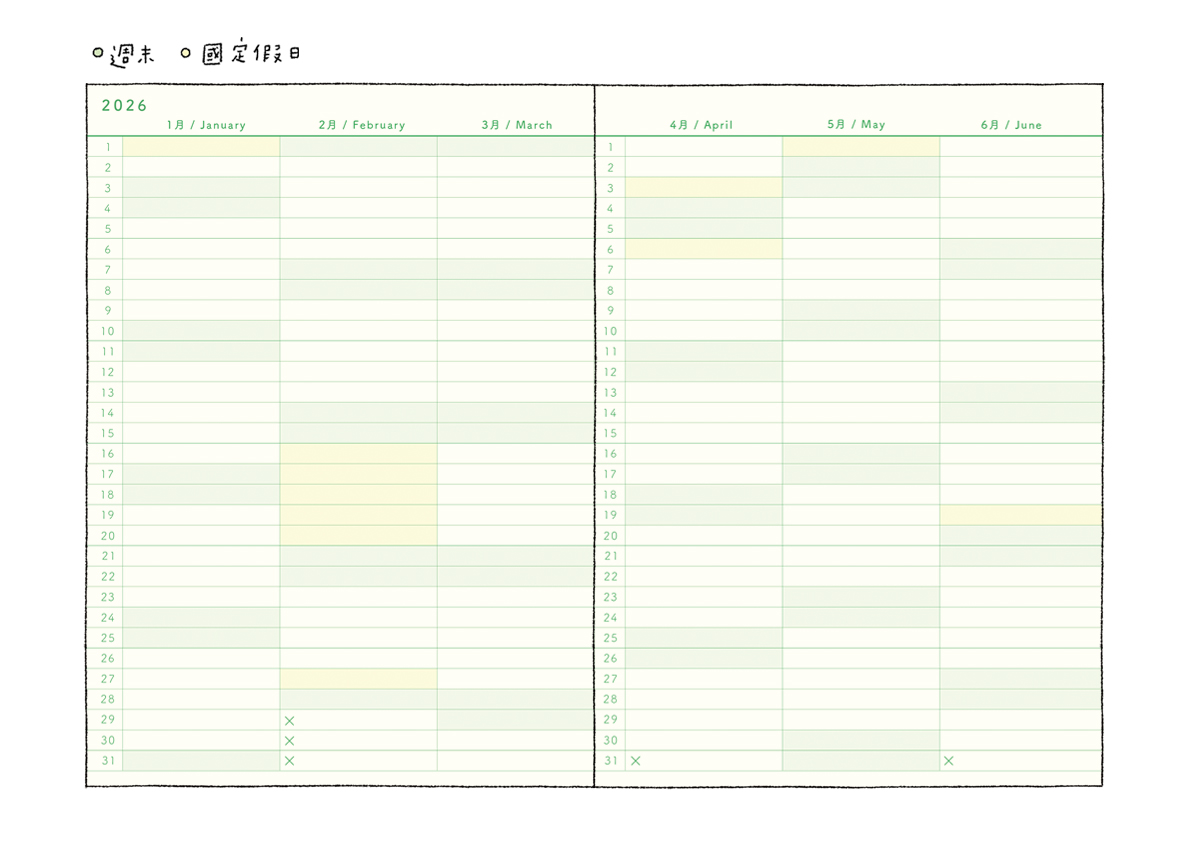 今年的年計畫頁同樣有週末和假日的兩種標示,