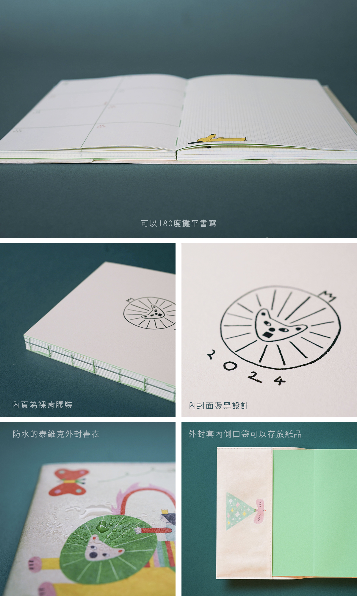採用可以180度完全攤平書寫的裸背穿線膠裝方式,